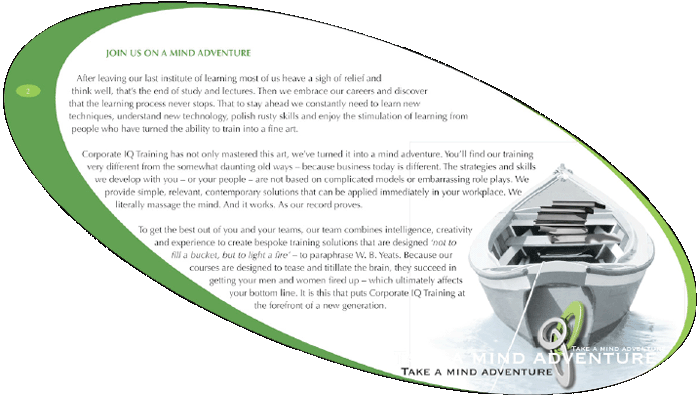 PAGE 2 After leaving our last institute of learning most of us heave a sigh of relief and think well, that’s the end of study and lectures. Then we embrace our careers and discover that the learning process never stops. That to stay ahead we constantly need to learn new techniques, understand new technology, polish rusty skills and enjoy the stimulation of learning from people who have earned the ability to train into a fine art. Corporate IQ Training has not only mastered this art, we’ve turned it into a mind adventure. You’ll find our training very different from the somewhat daunting old ways - because business today is different. The strategies and skills we develop with you or your people are not based on complicated models or embarrassing role plays. We literally massage the mind. And it works. As our record proves. To get the best out of you and your teams, our team combines intelligence, creativity and experience to create bespoke training solutions that are designed ‘not to fill a bucket, but to light a fire’ - to paraphrase W.B. Yeats. Because our courses are designed to tease and titillate the brain, they succeed in getting your men and women fired up - which ultimately affects your bottom line. It is this that puts Corporate IQ Training at the forefront of a new generation. Our view on corporate training ... it’s all to do with the mind