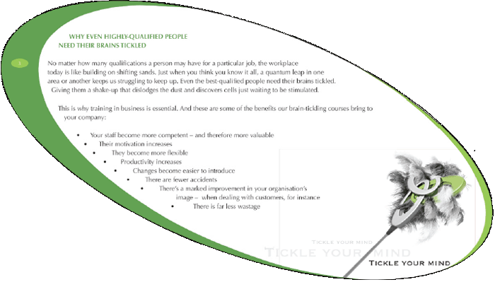 PAGE 3 No matter how many qualifications a person may have for a particular job, the workplace today is like building on shifting sands. Just when you think you know it all, a quantum leap in one area or another keeps us struggling to keep up. Even the best-qualified people need their brains tickled. Giving them a shake-up that dislodges the dust and discovers cells just waiting to be stimulated. This is why training in business is essential. And these are some of the benefits our brain-tickling courses bring to your company: . Your staff become more competent - and therefore more valuable . Their motivation increases . They become more flexible . Productivity increases . Changes become easier to introduce . There are fewer accidents . There’s a marked improvement in your organisation’s image when dealing with customers, for instance . There is far less wastage.